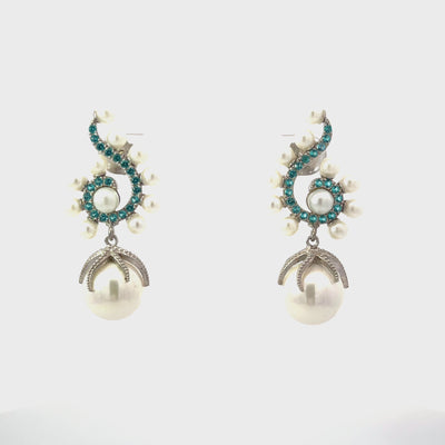 Add some iridescent magic to your wardrobe with our Majorica Round Pearl Poseidon Gemstone Drop Earrings! Our designer earrings feature a heavenly swirl design crafted from 925 sterling silver. Sparkling aqua cubic zirconia follow the line of the swirl and its outer edge is dotted with small round pearls. The drop portion of the design is adorned with beautiful majorica pearls that have round regular shapes, perfect for any fashionista who wants an accessory that is as unique as you are.