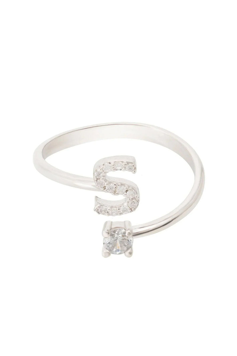 Pretty and petite, this initial ring features an open band, which allows for slight adjustability with sizing. The opening is designed to be on top of your finger, where your zircon adorned monogram is on one side and a single larger cubic zirconia resides on the other.