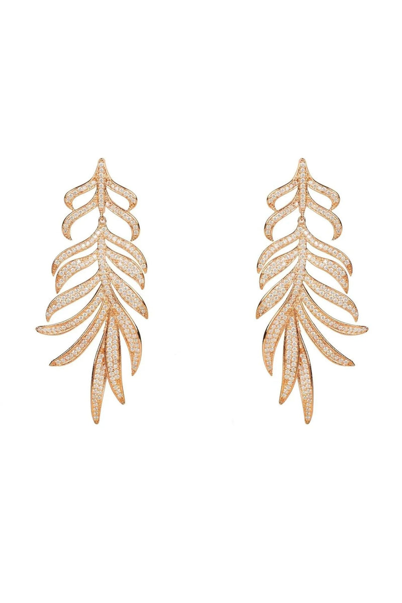 The Feathered Leaf Statement Drop Earrings are crafted from 925 sterling silver that is dipped in 22ct rosegold and feature white cubic zirconiaβs. They come in a length of 7cm and are 3cm wide, just perfect to make a statement.