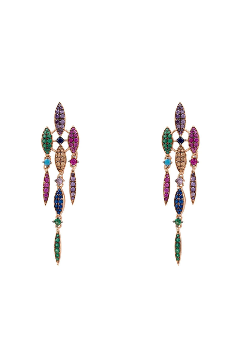 Made from 925 sterling silver dipped in 22ct rosegold, the Valencia statement drop earring dazzles with an abundance of multi-coloured sparkling zircons beautifully set within eight marquis shaped settings and single square cut zircons, all linked together in a triple strand drop design.Β The top four settings are fixed, while the others are linked by chain links, which gives the earrings a degree of flexibility for added sparkle as they move.