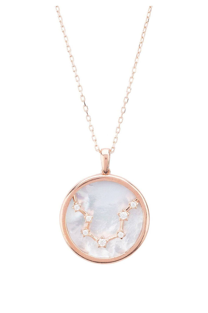 The natural beauty of white mother of pearl makes the perfect back drop to the sparkling star constellation in this zodiac pendant necklace. The reverse of this pendant is equally as beautiful, featuring cut-out stars with the soothing properties of mother of pearl gently peeping through and the engraved name of your star sign.