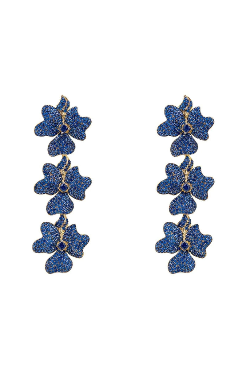 Jasmine Flower Triple Drop Earrings Gold Sapphire Blue