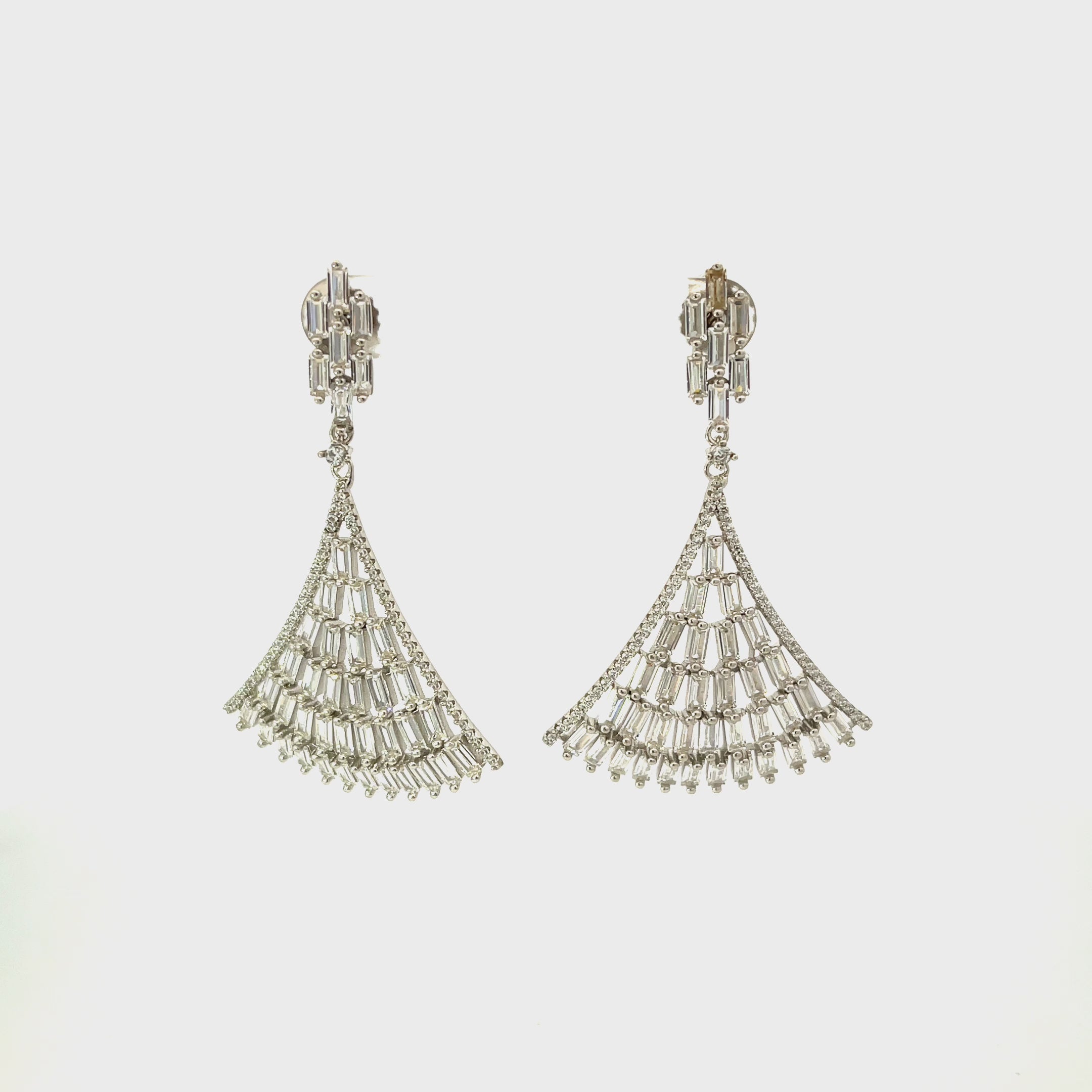 Take your look from okay to outstanding with our decadent Baguette Fan Tail Earrings in silver. Inspired by the glamorous 1920's these art deco fan tail earrings are expertly crafted from 925 sterling silver and hand set with micro pave white zircons and magnificent baguette cut zircons for extra sparkle, that catch the light from all angles with the natural movement of wearing them.