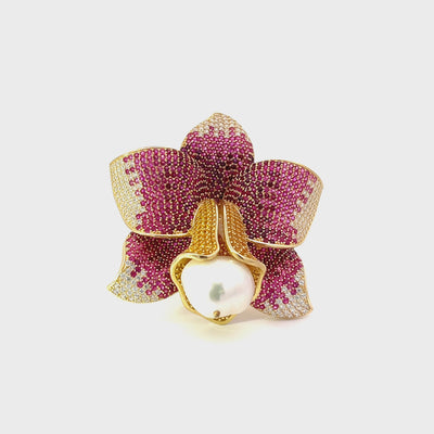 Meticulously handcrafted with 925 sterling silver that has been dipped in gold. This stunning cocktail ring is designed with exquisite detail, featuring ruby pink, yellow, and white zirconia, topped off with a single pearl inside the trumpet of this majestic flower to add a hint of elegance and class.