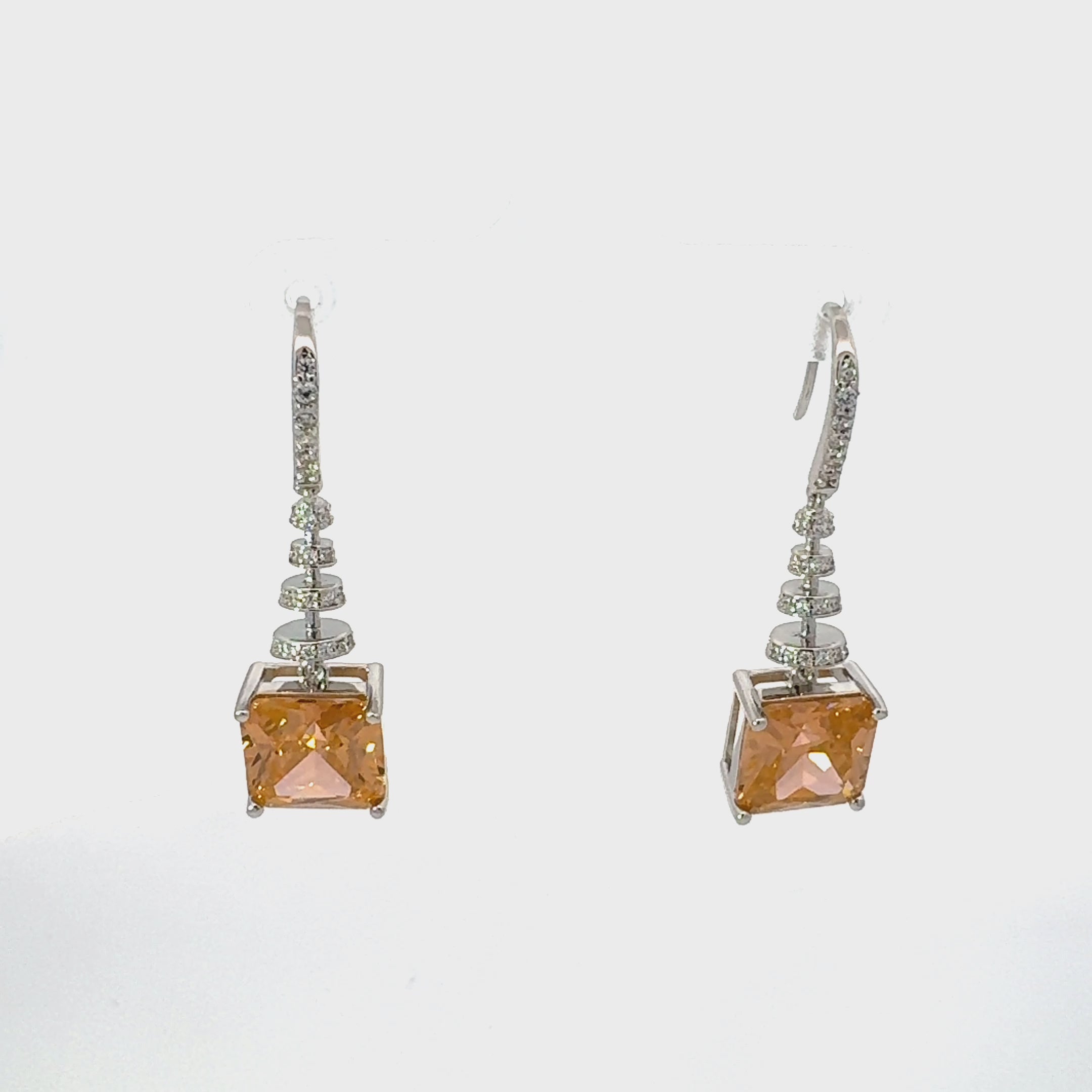 The fixed hook fastening leads down to a square multi-faceted peach coloured zircon, but not before it’s glitzed up along the way. Four rings of ascending size are decorated with zircon to form a lovely sparkling spiral. For even more dazzle and shine, the larger zircon is placed in an attractive deep silver setting.