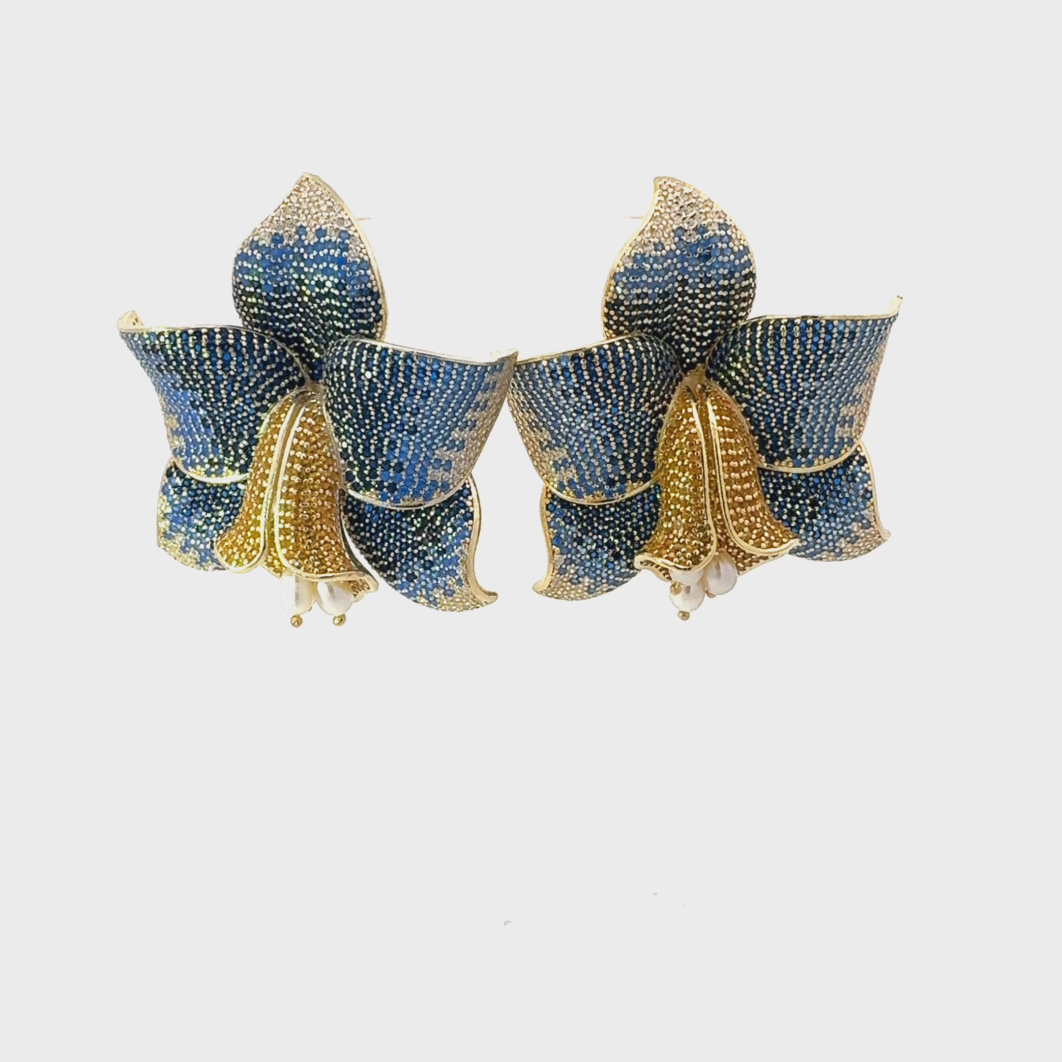 Daffodil With Pearls Earrings Gold Sapphire CZ - LATELITA Earrings