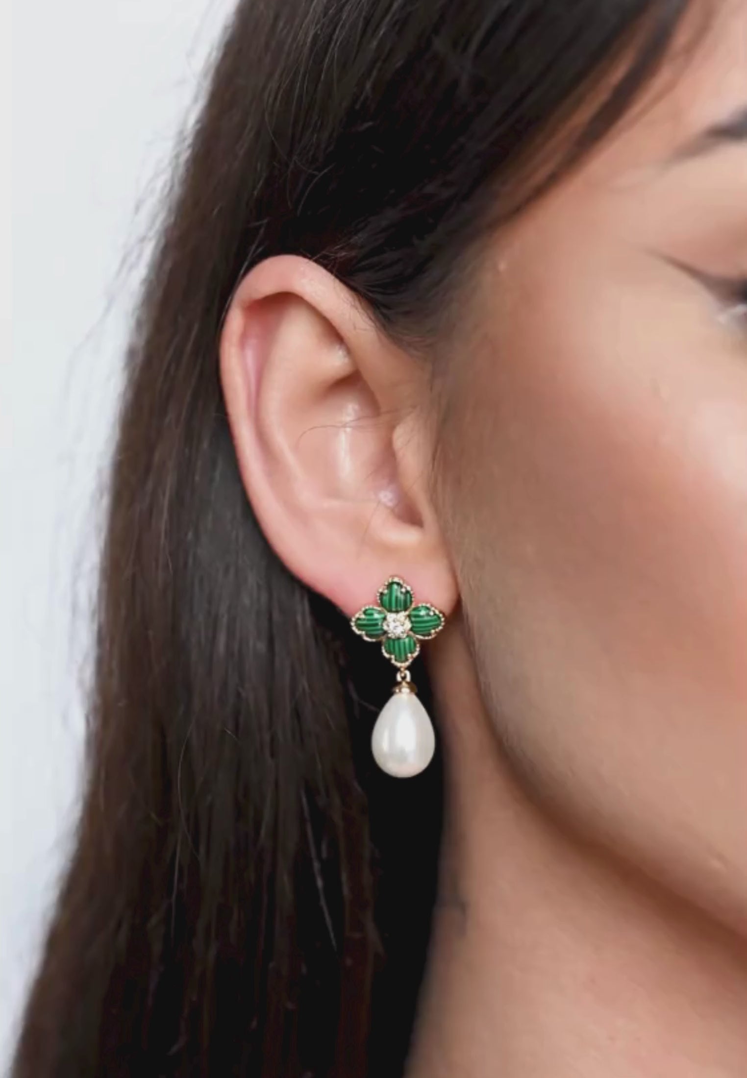 Añade un toque de elegancia con nuestros pendientes colgantes de perla y trébol de flores en oro. Elaborados con maestría en plata de ley 925 y bañados en oro de 18 quilates, estos impresionantes pendientes presentan cuatro pétalos, cada uno adornado con una impactante malaquita, una gema venerada por sus propiedades transformadoras y protectoras. En el centro de cada trébol, una brillante circonita cúbica aporta un sutil brillo.
