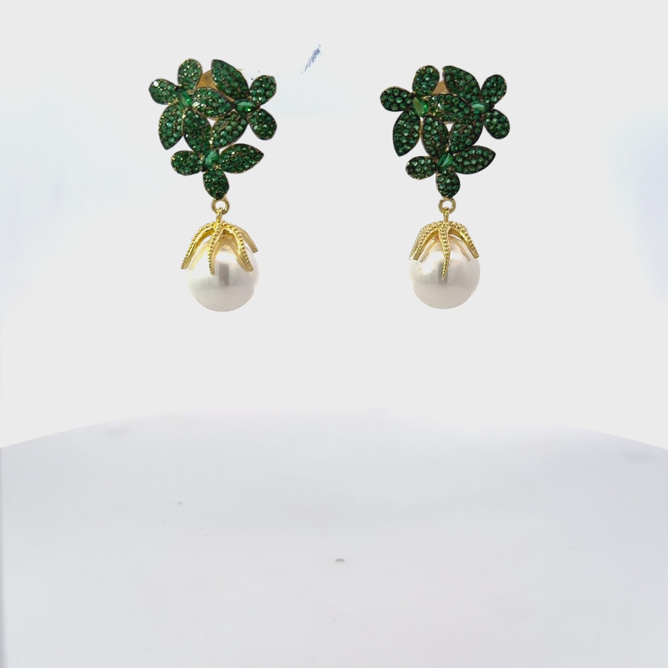 Pendientes de perlas y flores en oro verde esmeralda