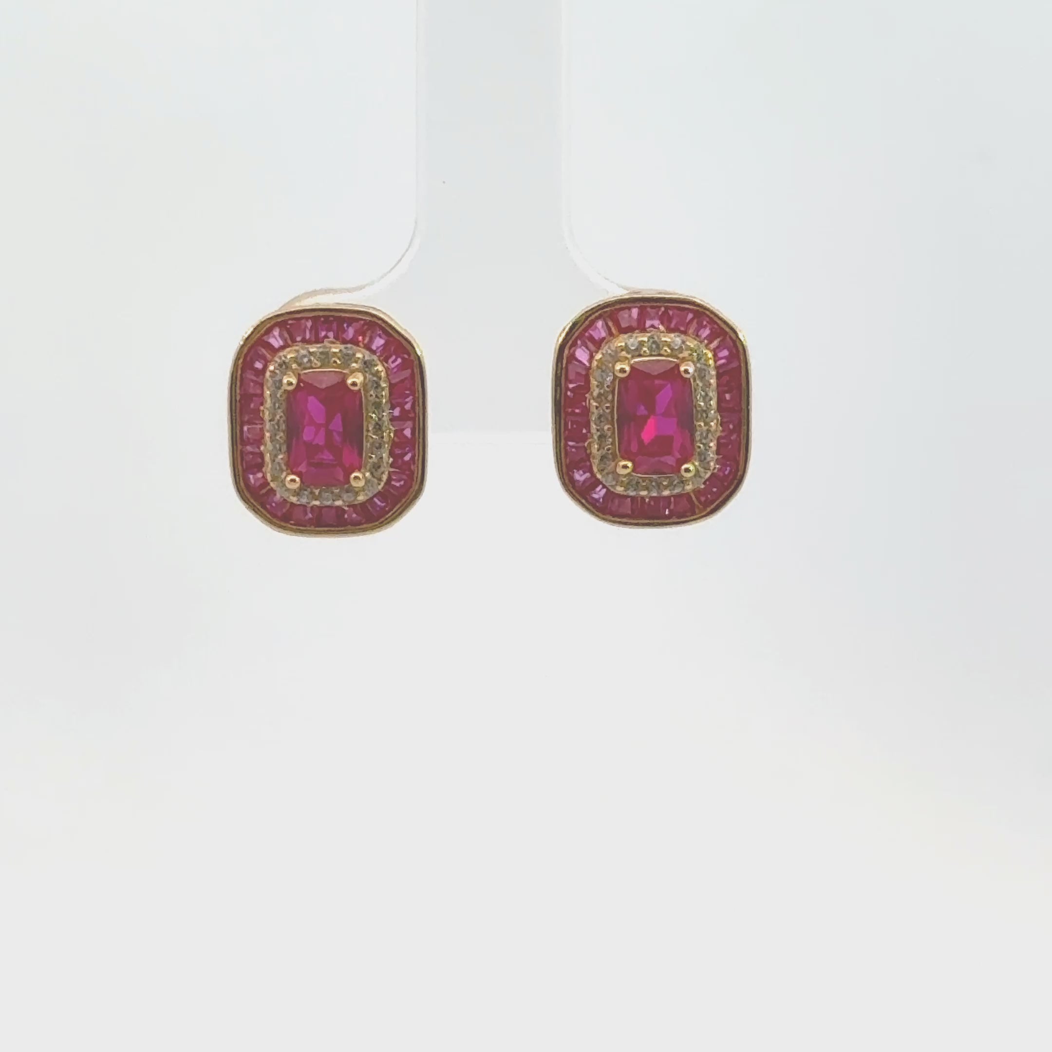 Each earring features a rectangular ruby framed by a halo of sparkling cubic zirconia, while the outer edge is lined with baguette cut stones that enhance the structured, architectural look. They pair beautifully with the matching pendant necklace and cocktail ring for a complete Gatsby inspired ensemble. The post and butterfly fastening makes them easy to wear, and with dimensions of 1.2 cm by 1.0 cm and a weight of 3.4 grams, they stay light and comfortable.