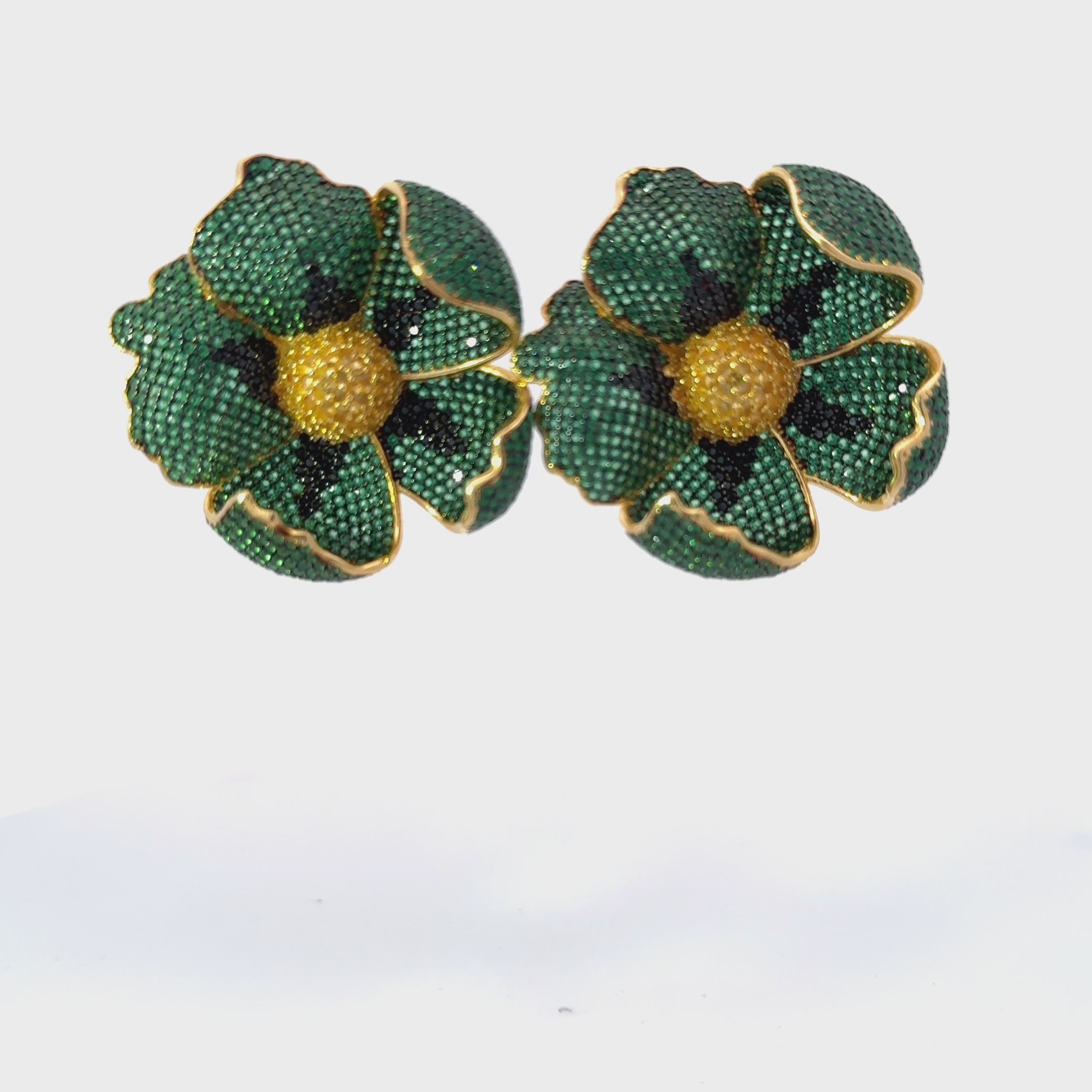 Estos grandes pendientes de amapola están adornados con brillantes circonitas cúbicas verde esmeralda y negras en cada pétalo . En el centro, brillantes circonitas amarillas . Su diseño tridimensional les da un toque especial y sofisticado a cualquier look.