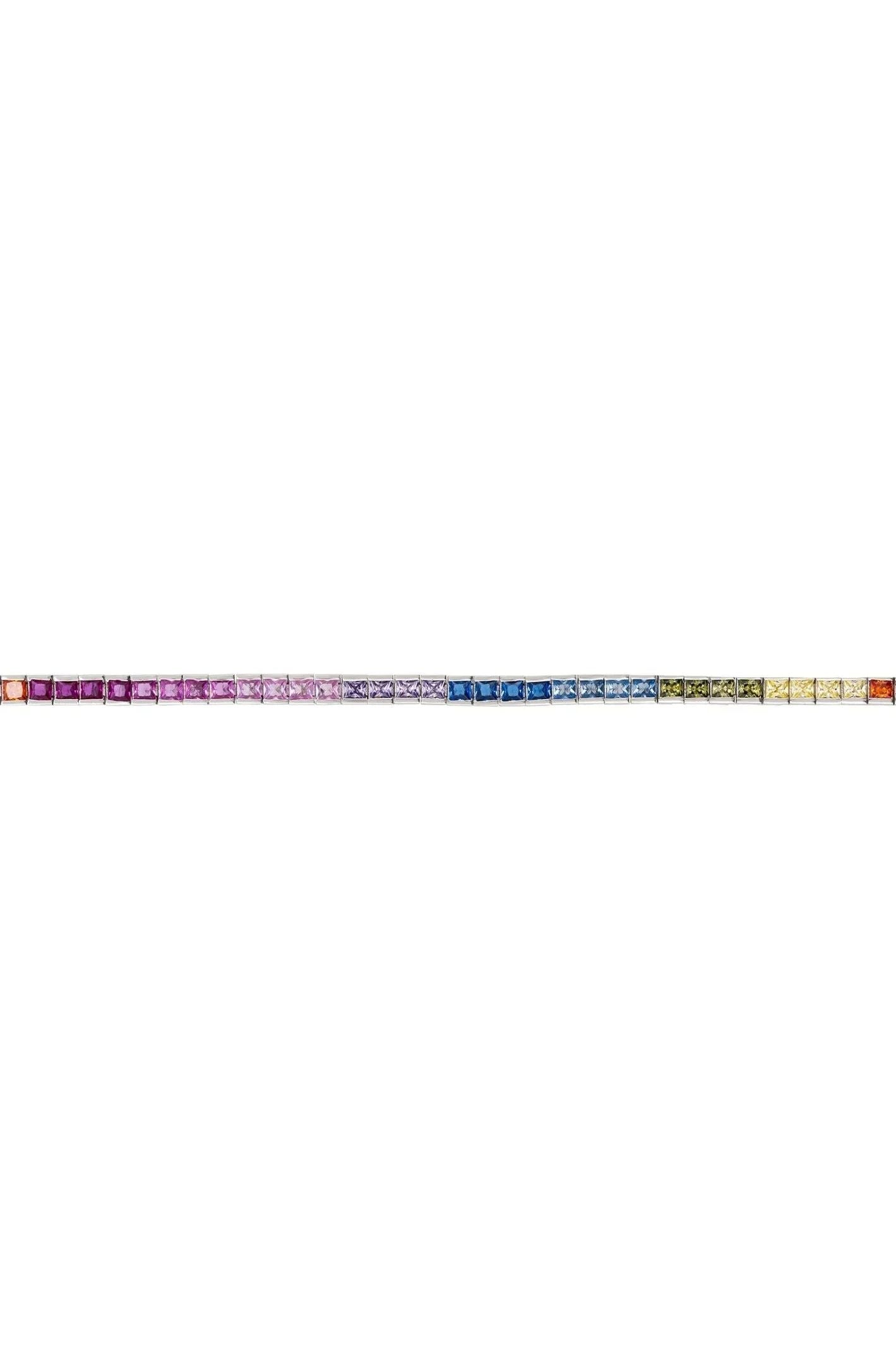 ¡Aporta brillo y belleza a cualquier conjunto con la pulsera de tenis plateada Over The Rainbow! Esta pulsera única fue hecha a mano con plata de ley 925, por lo que está hecha para durar. Dale a cualquier look una explosión de color con esta impresionante pulsera de arcoíris. ¡Está decorado con circonitas cúbicas multicolores de talla cuadrada que brillan como diamantes!