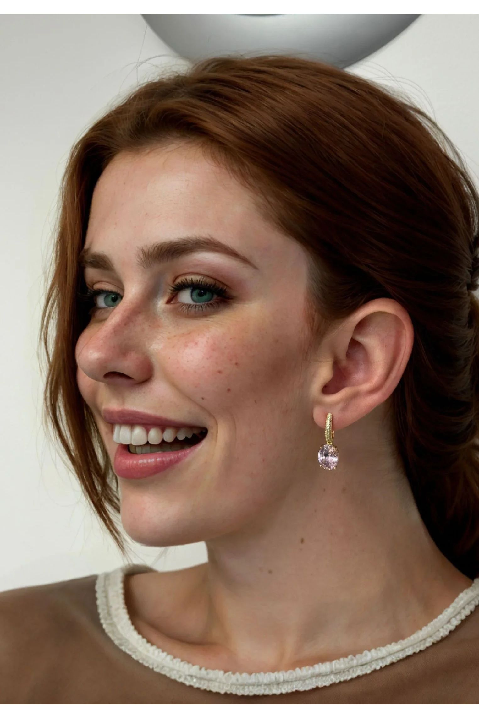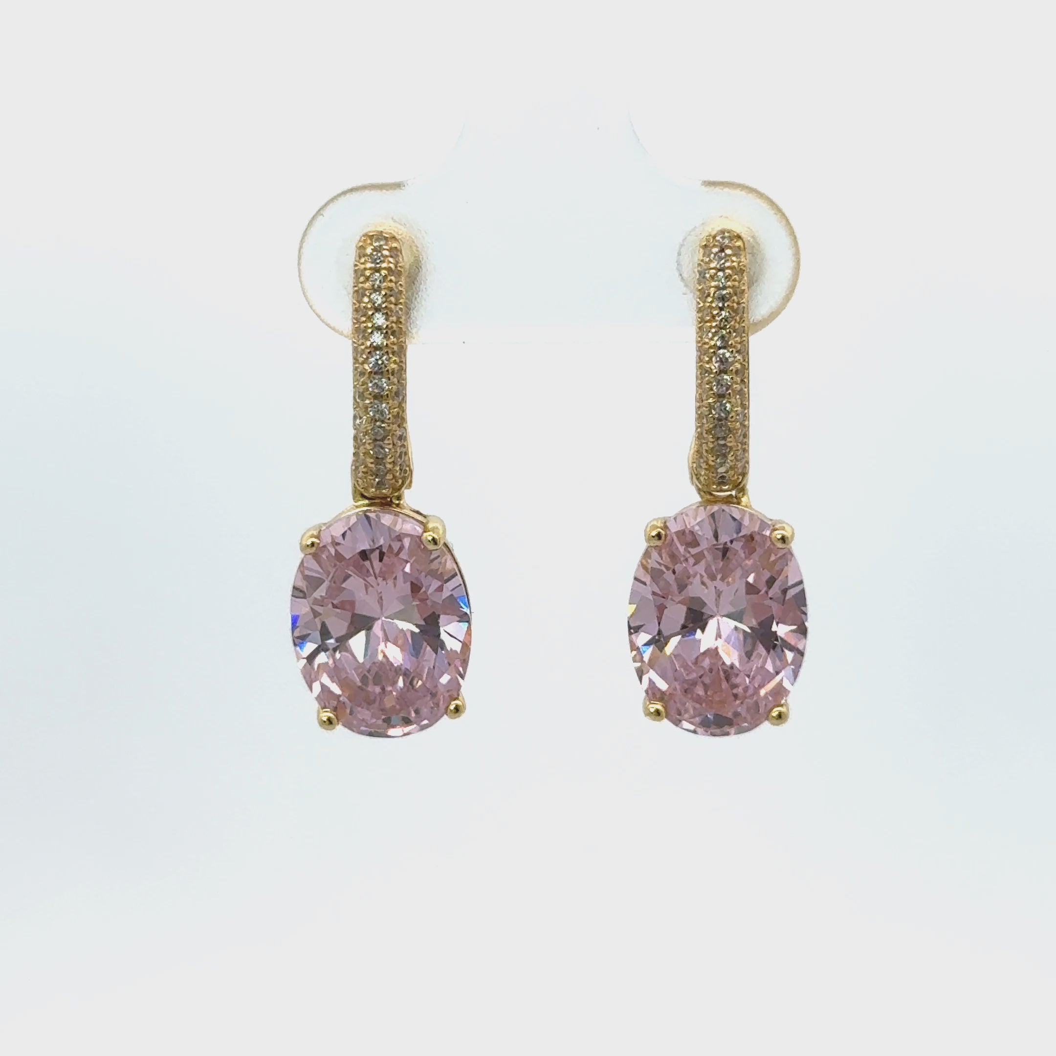 These beautiful, handcrafted earrings are made from 925 sterling silver, that has been dipped in 18ct gold and feature an oval-shaped Morganite gemstone. Along the front edge of the latch closure are small simulated diamonds for added sparkle and visual interest. With a length of 2.6cm and 0.9cm wide and weighing 6.0g, these stunning earrings are both comfortable to wear whilst being easy to apply and remove.