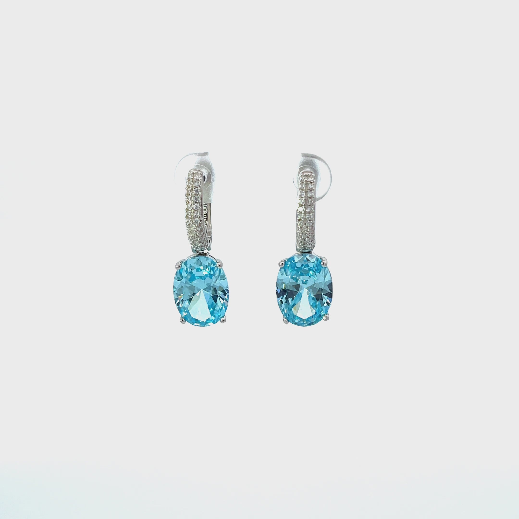 These beautiful earrings, handcrafted from 925 sterling silver, feature an oval Blue Topaz gemstone, accented with shimmering simulated Diamonds along the front edge of the latch back closure. With a length of 2.6cm and 0.9cm wide and weighing 6.1g, these stunning earrings are both comfortable to wear whilst being easy to apply and remove.