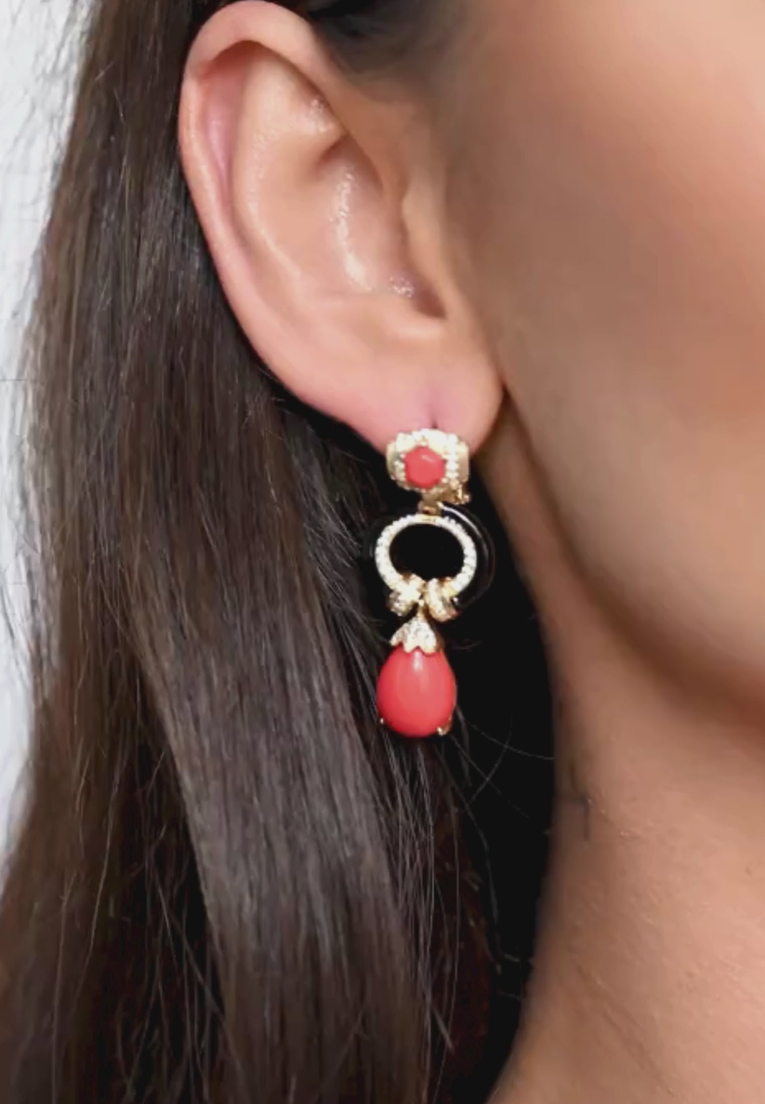 A round coral gemstone is set at the top, surrounded by glimmering zirconia for added sparkle. Below, a pear-shaped coral dangles gracefully, adding warmth and vibrancy to the design. Between the stones, an open-ended black enamel circle is adorned with zircon accents along the inner curve and the open tips of the circle, which cradle the pear-shaped coral stone.