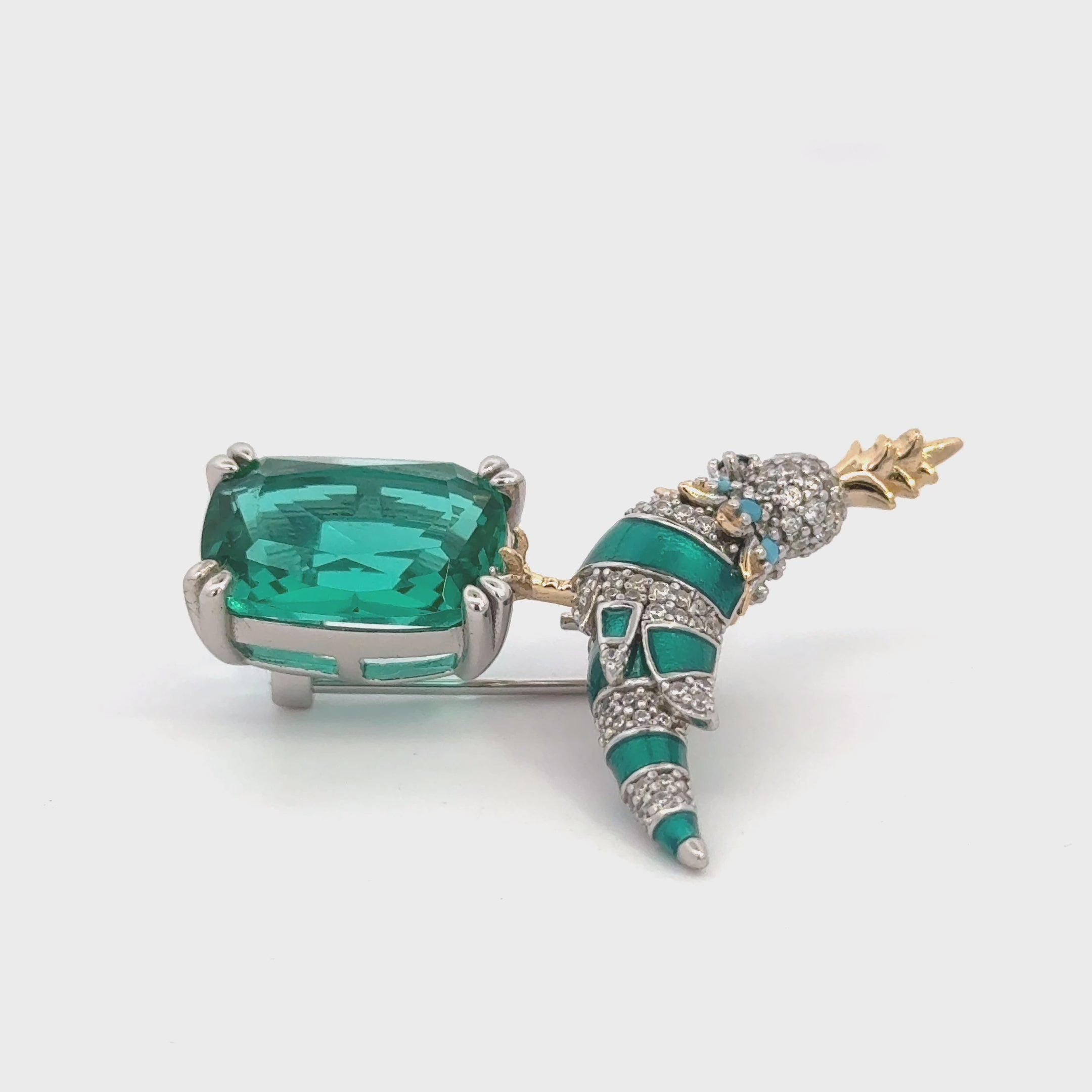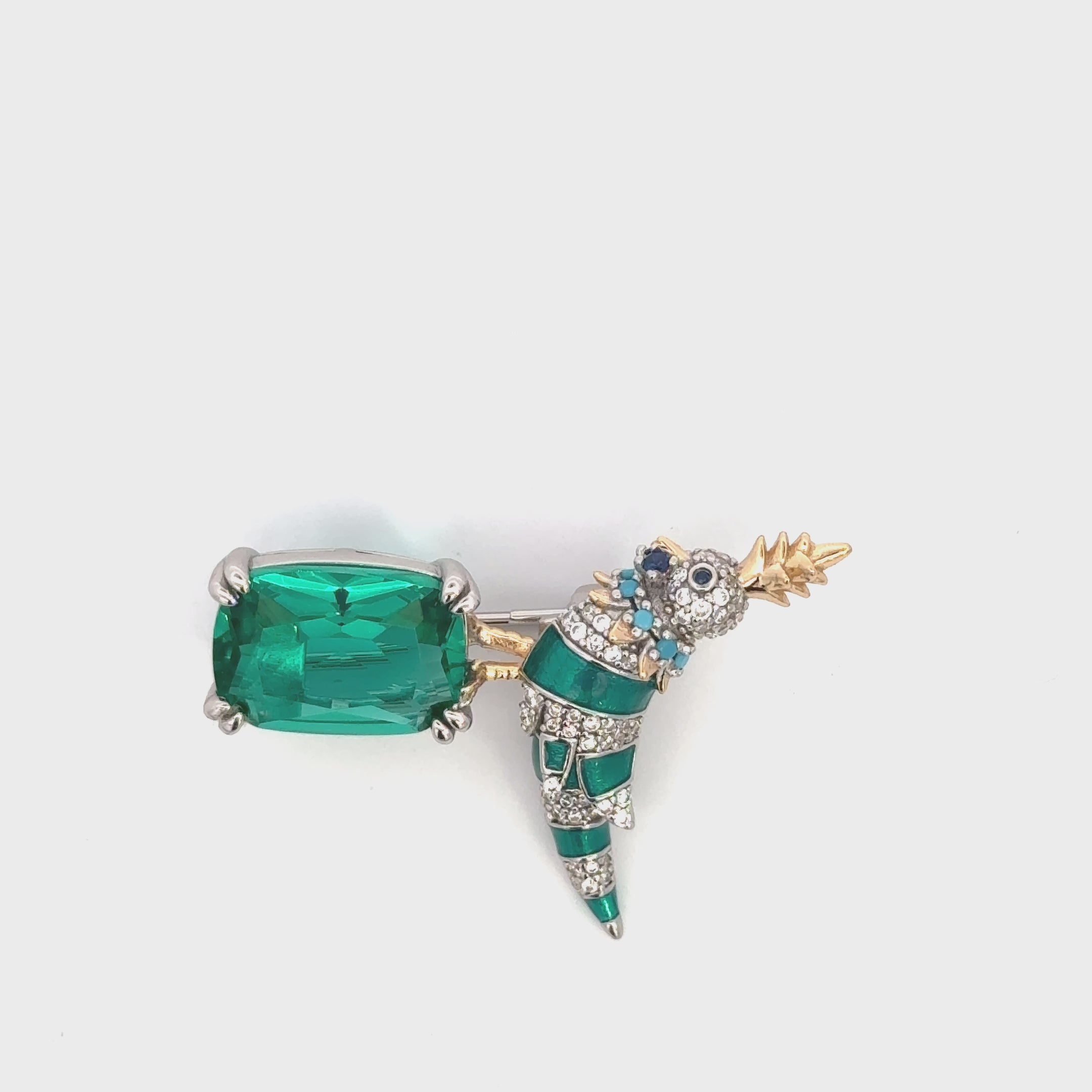 Handcrafted from 925 sterling silver, the birdβs body is brought to life through a vivid green enamel finish, enhanced by a trail of sparkling clear zircons that catch the light with every turn. Its crest and legs are accented in lustrous gold plating, adding warmth and contrast to the design. A delicate collar of turquoise zircons encircles the neck, drawing the eye with a subtle pop of colour. Perched confidently atop a rectangular-cut lab-grown emerald, the love bird forms a stunning focal point.