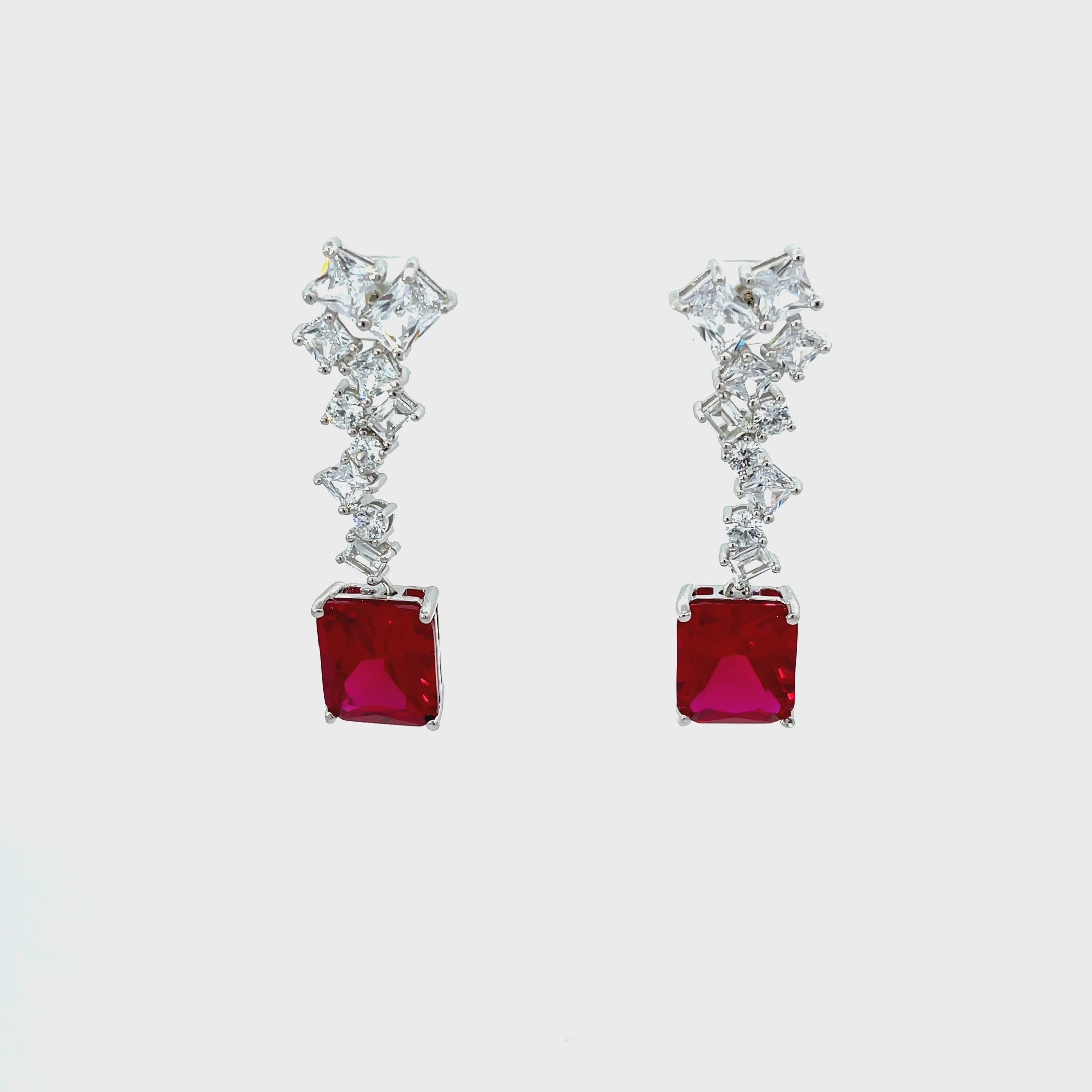Handcrafted from 925 sterling silver, a large rectangular ruby gemstone is suspended from an intricate zig-zagging design setting adorned with simulated diamonds, making these earrings even more special. Add a touch of luxury to any outfit with the deep red hues of rubies.