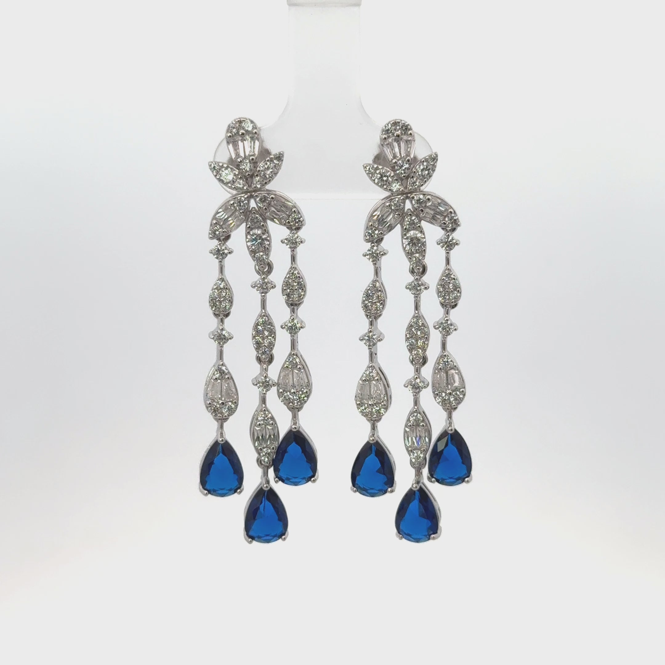 At the base of each strand, a striking teardrop-shaped lab-grown sapphire sways gently, offering that perfect pop of deep, regal blue. Measuring 5.0 cm in length and 1.3 cm wide, and weighing 10.0 grams per pair, your earrings are bold yet beautifully wearable.