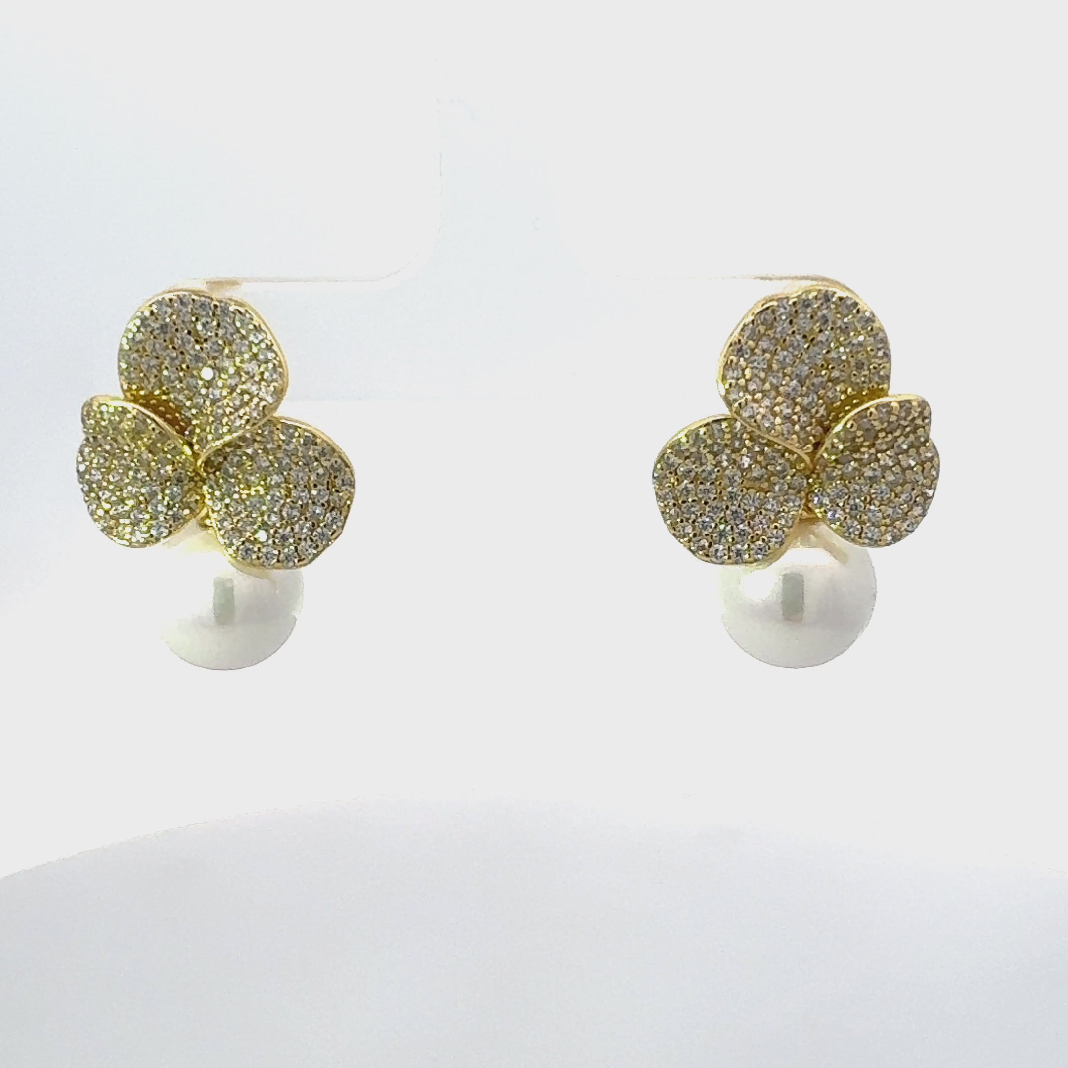 Add a touch of elegance and romance to your look with our Iris Flower and Pearl Dangle Earrings. These stunning earrings are exquisitely handcrafted in 925 sterling silver, gracefully dipped in 18ct gold for a luxurious finish. Inspired by the beauty of nature, the top of each earring features a charming floral motif, composed of three petals intricately adorned with sparkling cubic zirconia. Dangling gracefully beneath this floral enchantment is a lustrous round white pearl, embodying classic sophistication.