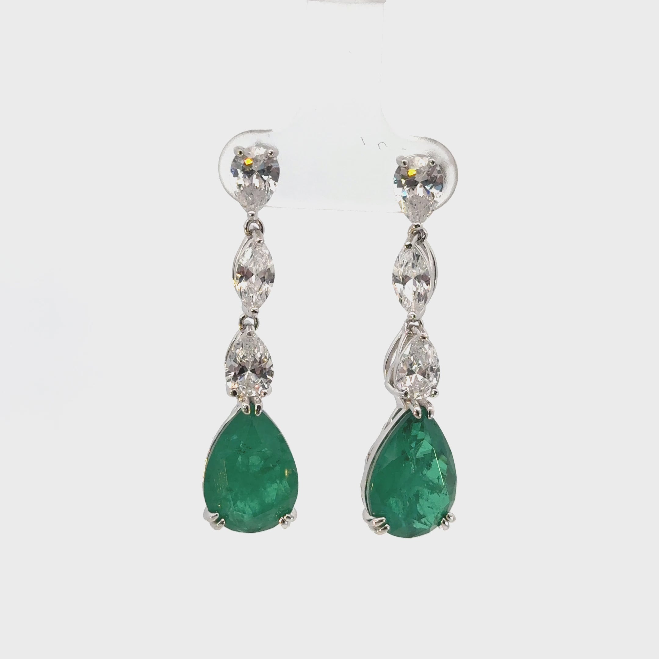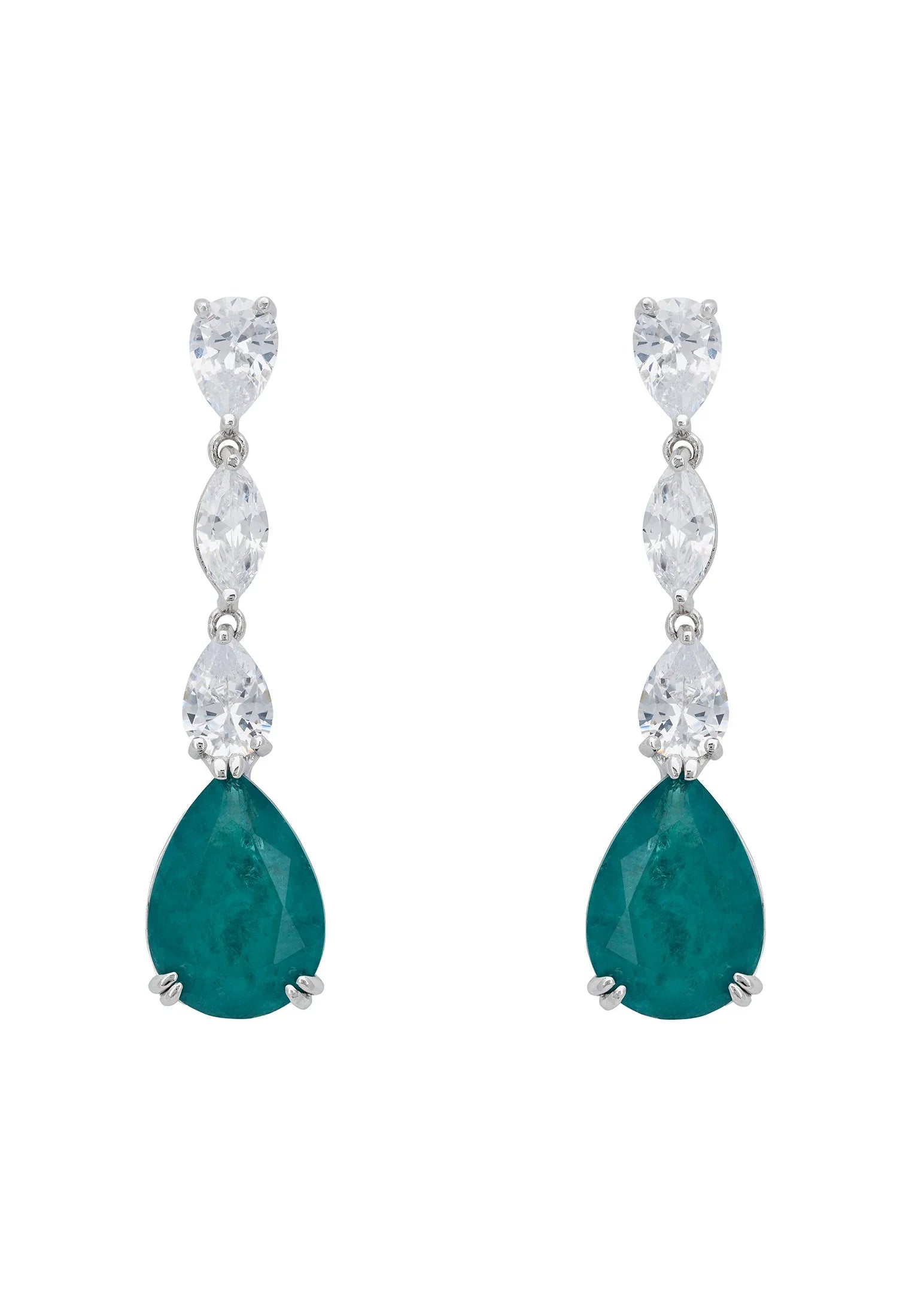 Embrace elegance with the Keira Colombian Emerald Drop Earrings, a masterpiece of refined design and artistry. Crafted from 925 sterling silver, these earrings showcase a mesmerizing teardrop-shaped lab-grown Colombian emerald. This vibrant green gem delicately dangles from a shimmering trio of Marquis-cut simulated diamonds, creating an exquisite harmony of colour and sparkle.