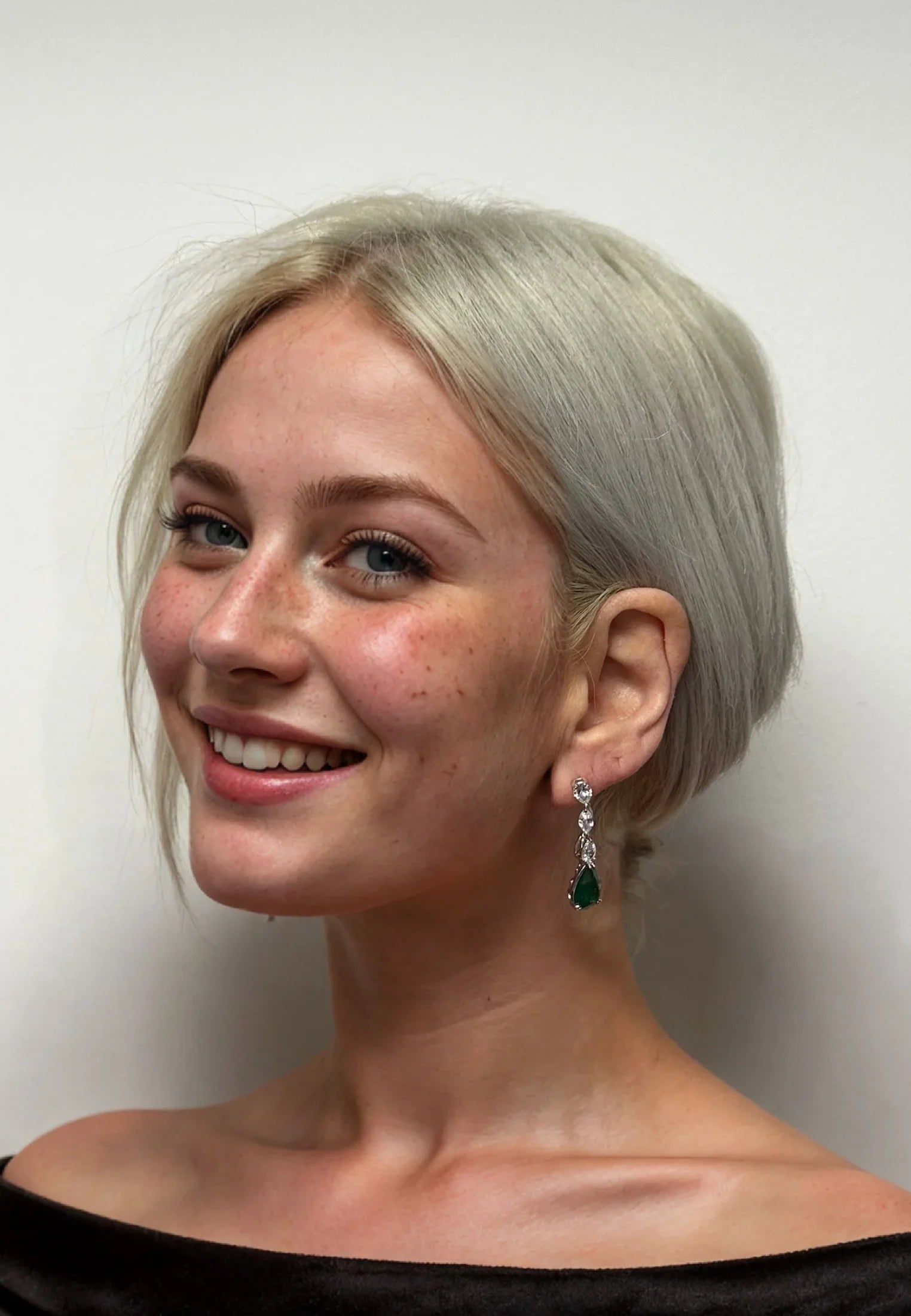 Measuring 4.2 cm in length and 1.0 cm in width, and weighing a mere 7.1 grams, the Keira earrings are as comfortable as they are captivating. Perfectly balanced for effortless wear, they are designed to complement every style, from daytime chic to evening glam. Their striking combination of radiant emerald and dazzling diamonds ensures they catch the light and attention wherever you go.