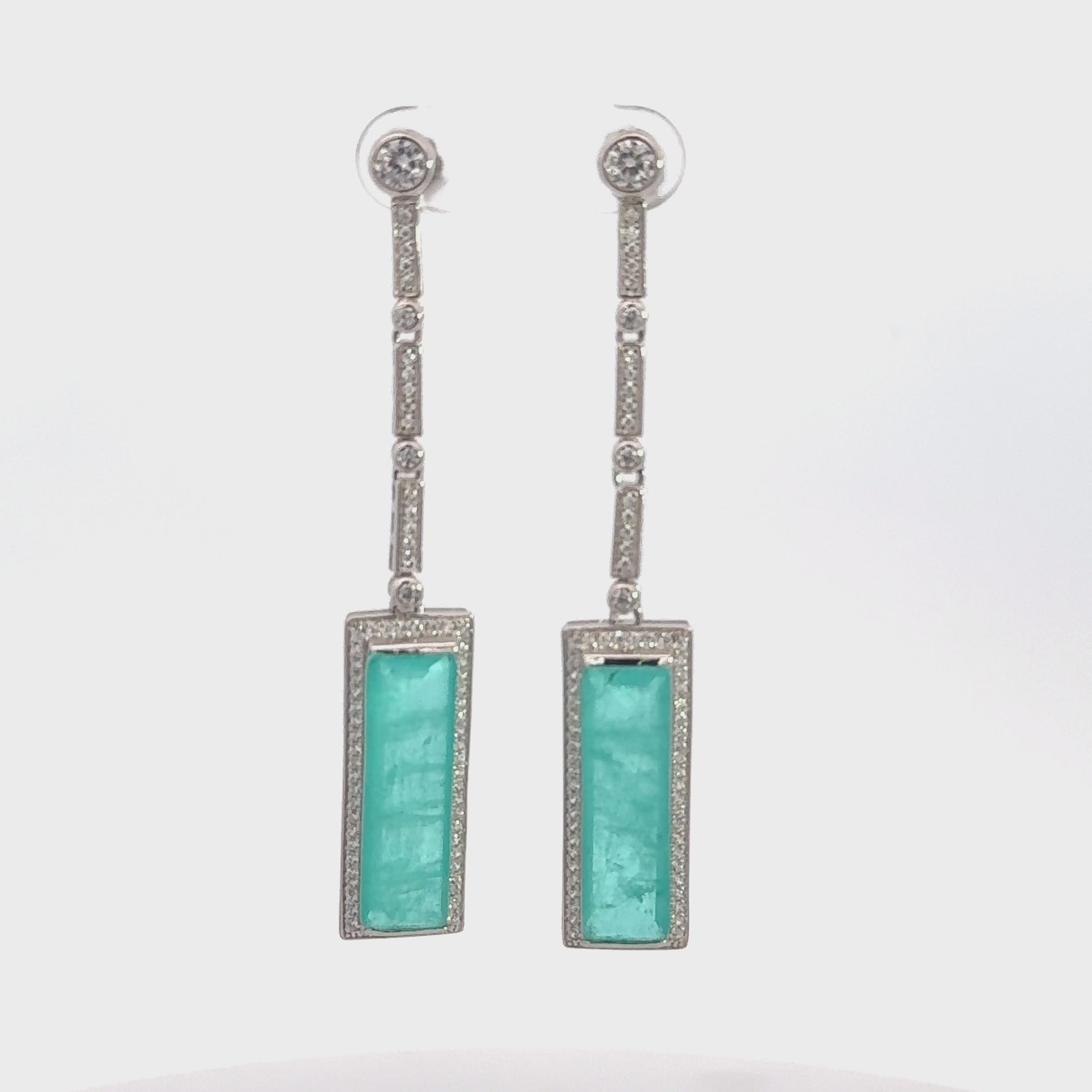 With their striking 6.5 cm length and elegant 1.0 cm width, these earrings are designed to dazzle. The lab-grown rectangular Paraiba tourmaline at the heart of the design radiates its signature aqua hue, evoking the serenity of tropical waters and symbolizing joy, energy, and self-assurance. Encased in a glittering halo of cubic zirconia and suspended from three articulated bars, each adorned with sparkling stones, these earrings shimmer with every movement.