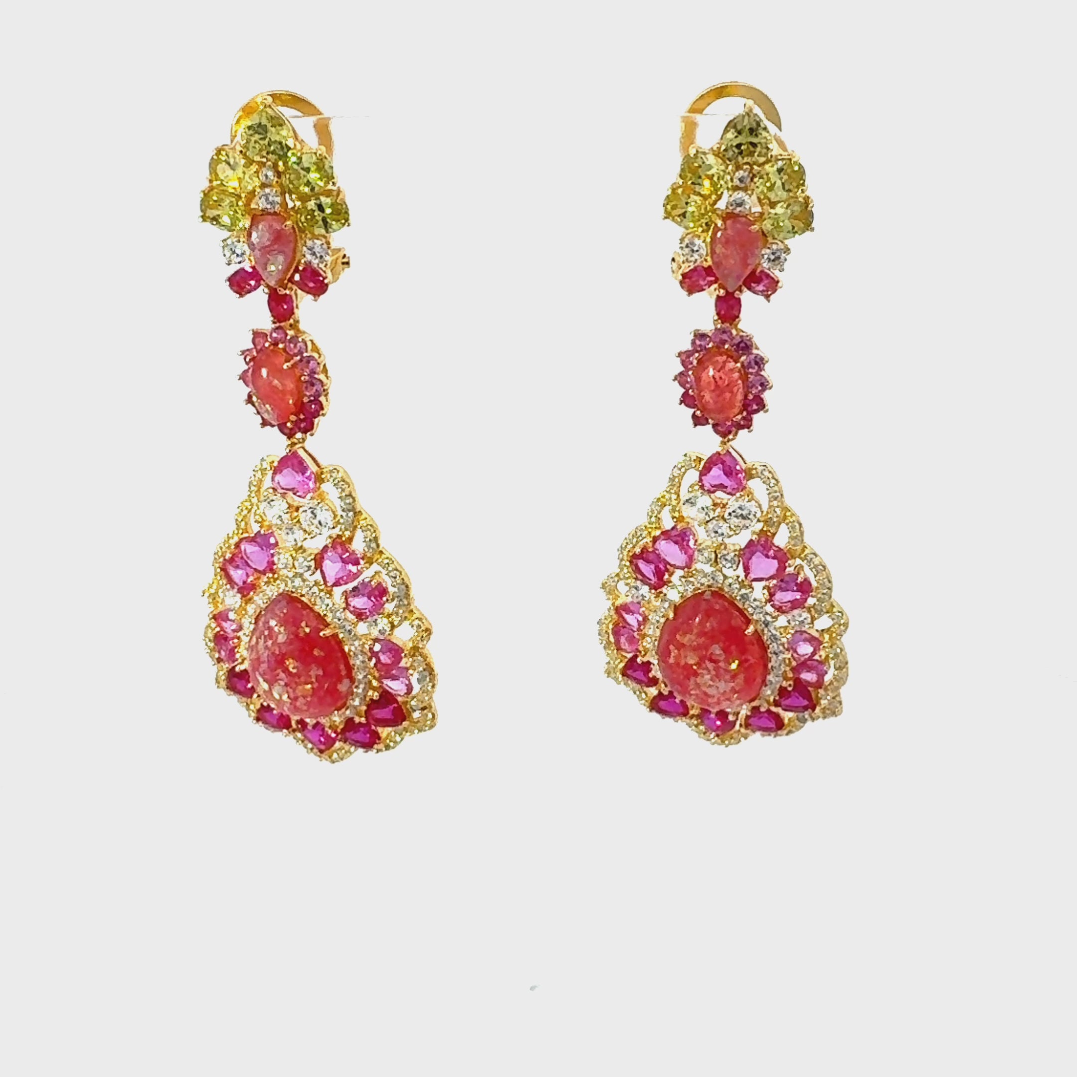 At the heart of the design are three dazzling pink opal, celebrated for their vibrant hue and romantic allure. The largest opal sits prominently at the centre of the teardrop, drawing attention with its vivid pink brilliance. A smaller opal is set as the earring topper, secured by an omega fastening for a secure and comfortable fit. Between the topper and teardrop lies a second, slightly larger oval opal, creating a graceful, dynamic movement that enhances the earrings' beauty when worn. Each section is adorned with clear zircon stones and lab-grown tourmalines, in a shimmering display of light and colour. The varied sizes of the zircons enhance the elegance of the design, making these earrings a true statement piece.