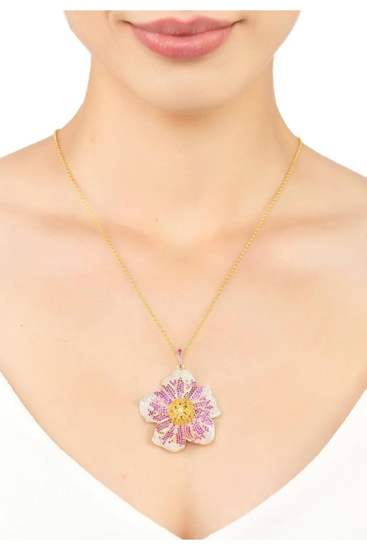 This large pansy pendant style necklace is adorned with sparkling cubic zirconia, with graduated shades of pink on the petals and vibrant yellow at its centre along with a zircon adorned bail, that allows the chain to slide through freely, made in a three dimensional style for added interest, which will add a touch of sophisticated style to any outfit.