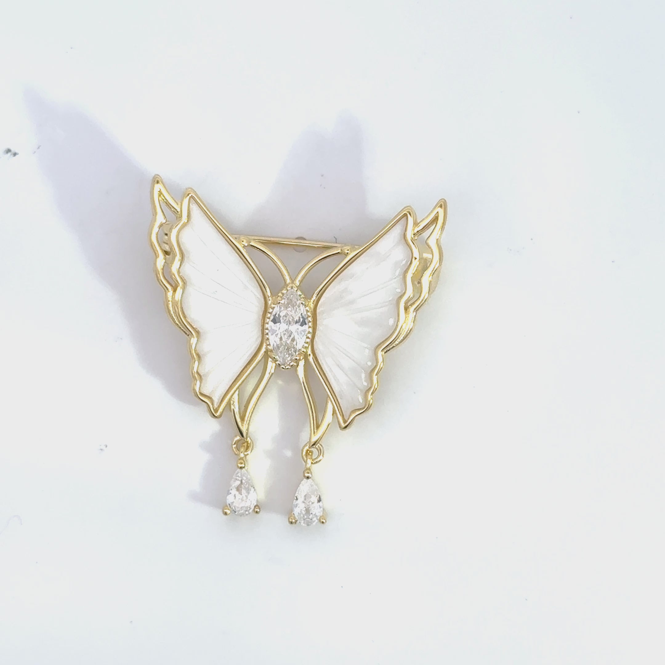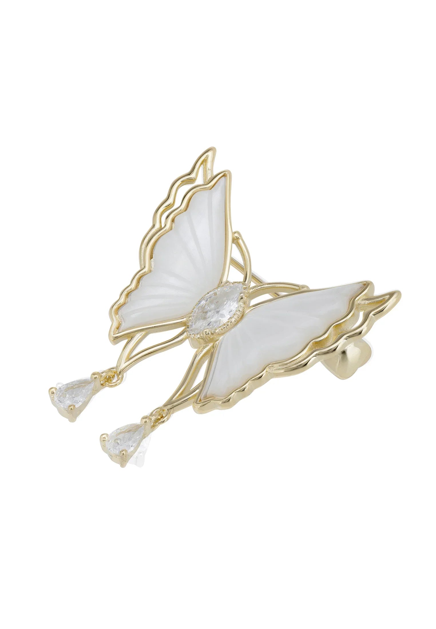 The wings shimmer with a natural pearl inlay, catching the light with every movement. A marquise-cut zircon forms the butterfly’s body, while two teardrop-cut zircons dangle gracefully from each wingtip—adding sparkle and dynamic motion.