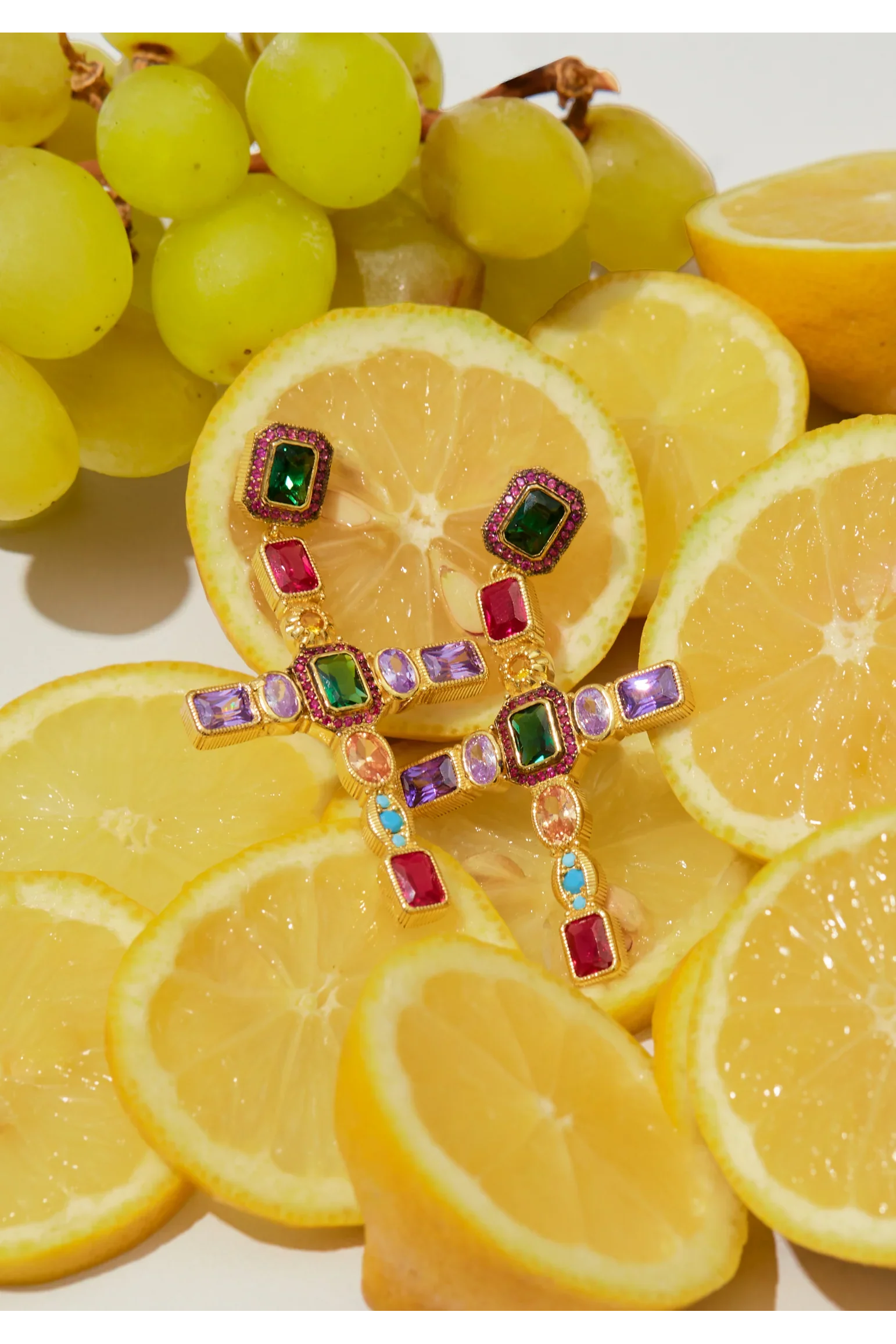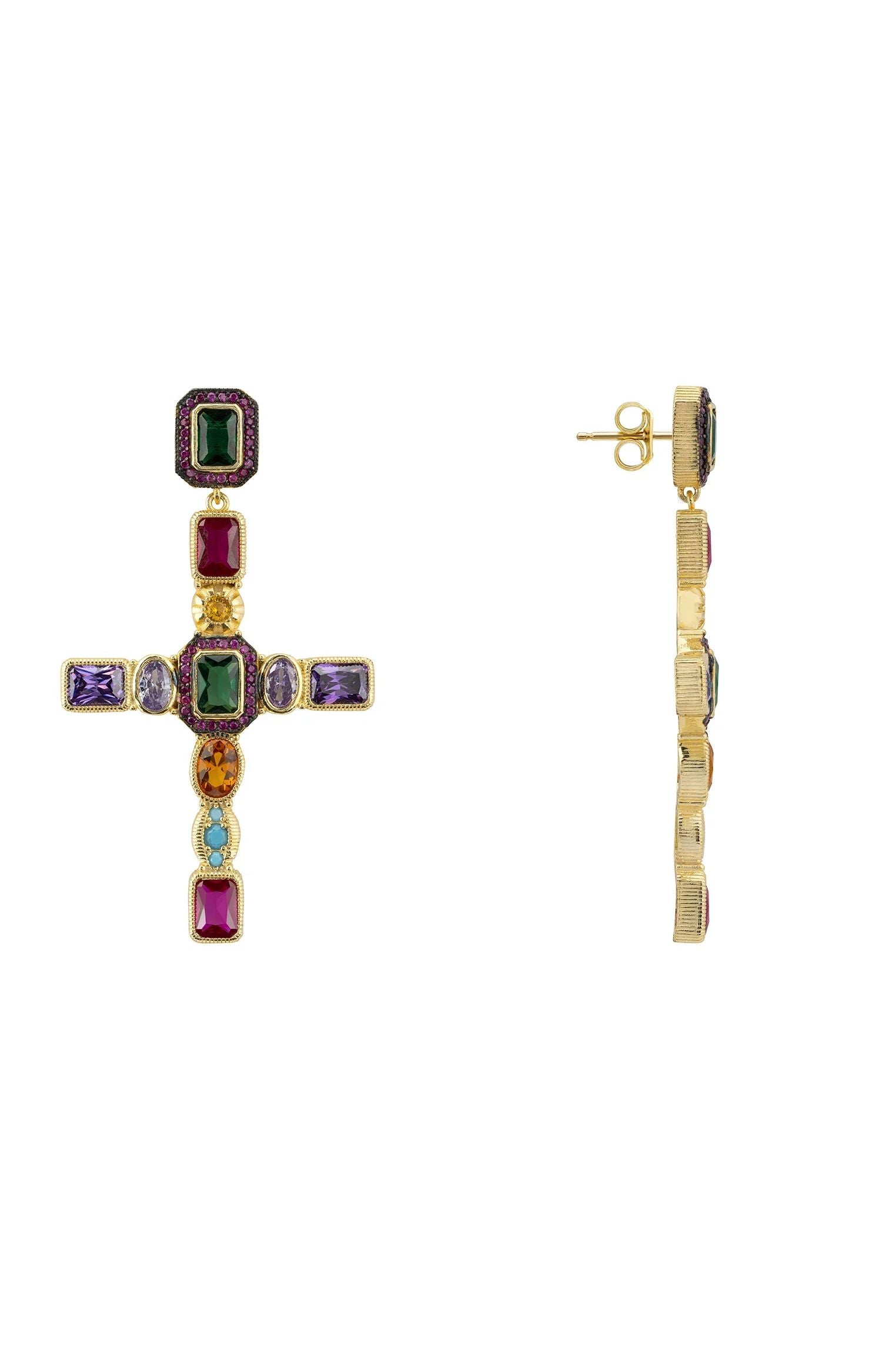 Introducing the Maria Extra Large Gemstone Fashion Earrings in Gold - a bold and beautiful statement piece that marries timeless elegance with a splash of vibrant colour. Crafted from high-quality 925 sterling silver and luxuriously dipped in 18ct gold, these earrings are designed to dazzle and delight. Adorned with vibrant lab-grown gemstones including turquoise, amethyst, ruby, quartz, and emerald. The colourful gems intricately cover the crosses, making each piece a vivid masterpiece.