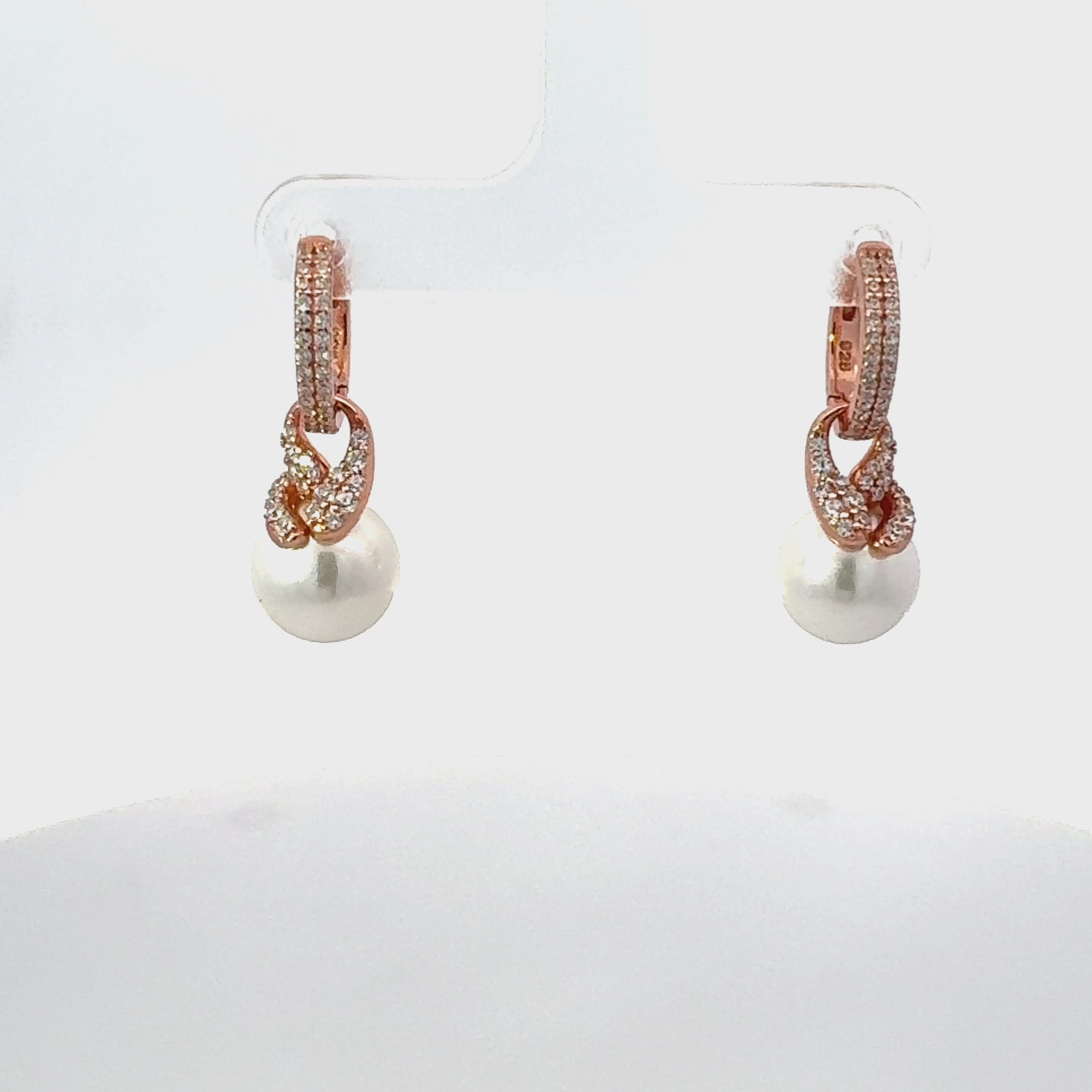 Introducing the Tie The Knot Drop Pearl Earrings in sleek rosegold – a symbol of unending love and commitment. Crafted from 925 sterling silver that has been bathed in 18ct rosegold, these earrings captivate with their shimmering cubic zirconia-adorned hoop and the delicate knot design at the base, each reflecting the light beautifully. Suspended from this intricate knot is a pearl, embodying serenity and the timeless beauty of nature.