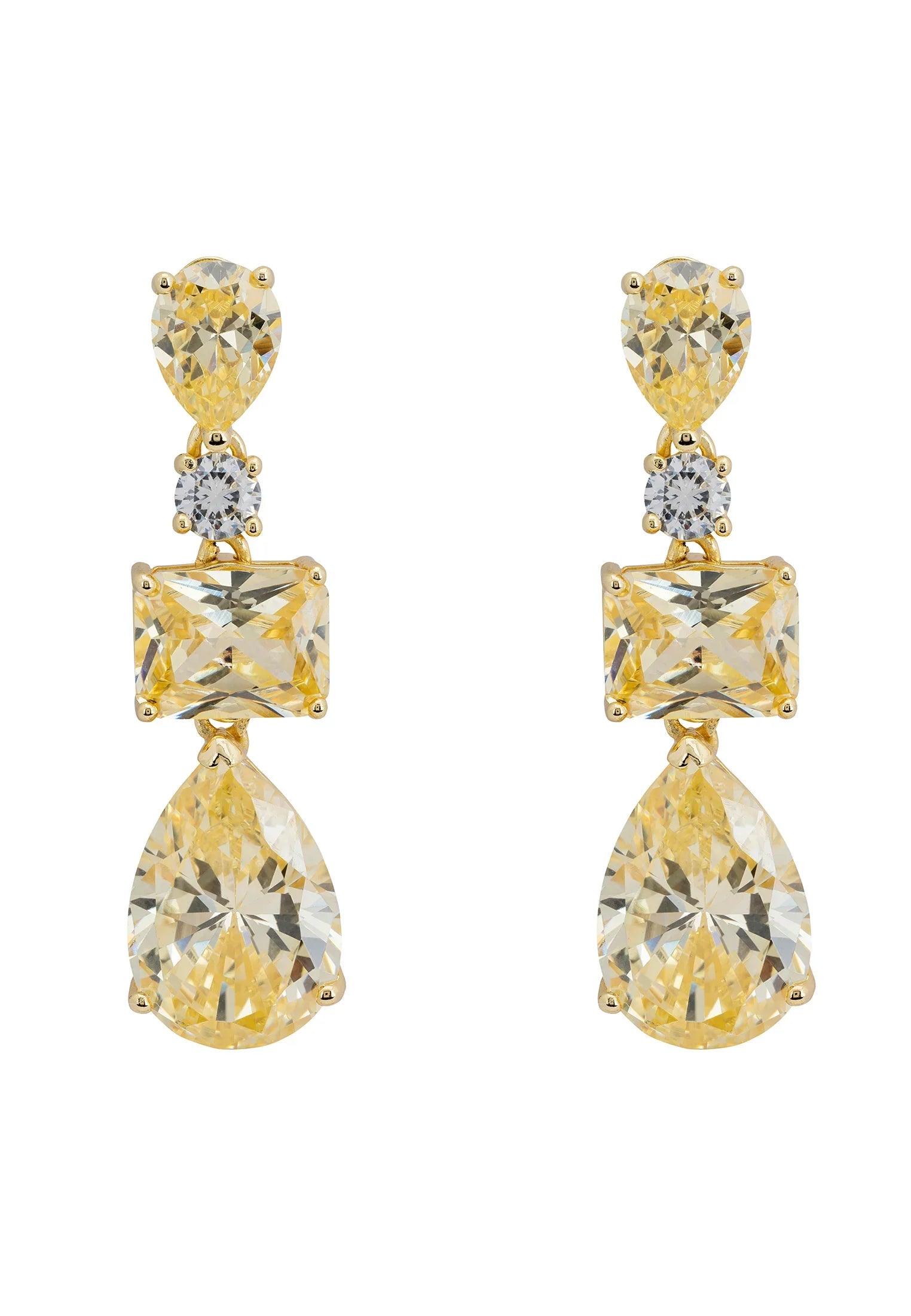 Fashioned from 925 sterling silver dipped in 18ct gold, these drop earrings incorporate a drop of four beautiful gemstones – two pear-shaped lab-created yellow topaz alongside a rectangular cut yellow topaz and a round cut simulated diamond – combined perfectly to create a subtle yet eye-catching piece.