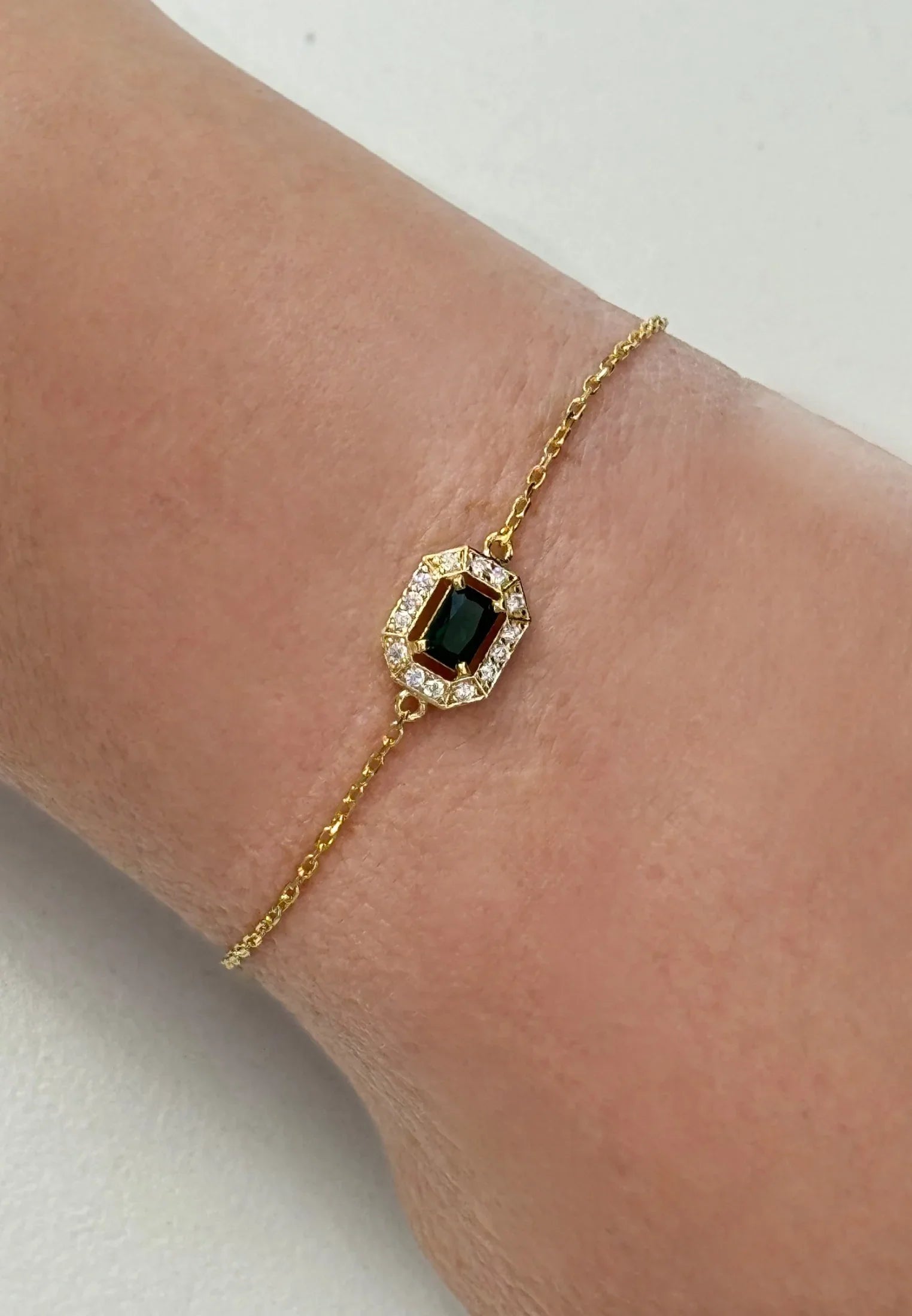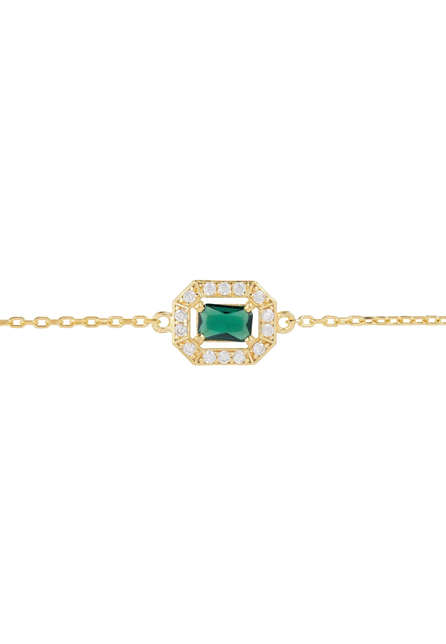 Your Whistledown bracelet is a graceful addition to your jewellery collection, handcrafted with care and designed for effortless elegance, using 925 sterling silver dipped in 18ct gold. At the centre, a radiant rectangular-cut emerald draws the eye—framed by a halo of shimmering cubic zirconia that adds just the right amount of sparkle.